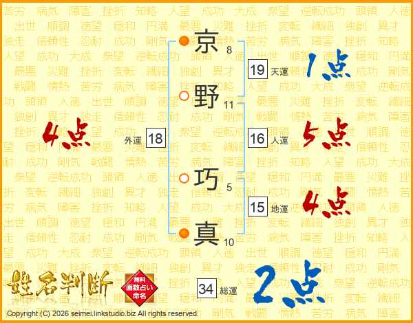 京野巧真さんの総運は34画の2点!