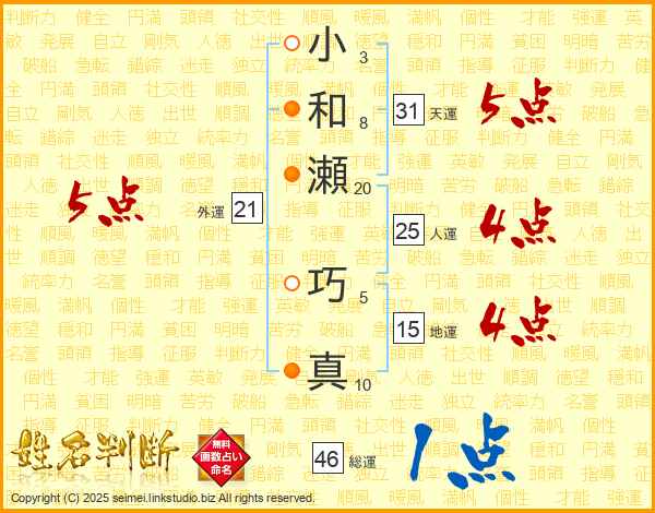小(3画)和(8画)瀬(20画) 巧(5画)真(10画)