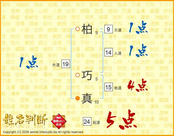 生活面を象徴する運勢です。外部から受ける影響力を表し、結婚運、家庭運や職場、環境への順応性を表します。総運から人運を引いた画数。姓や名が1文字の場合を除く。