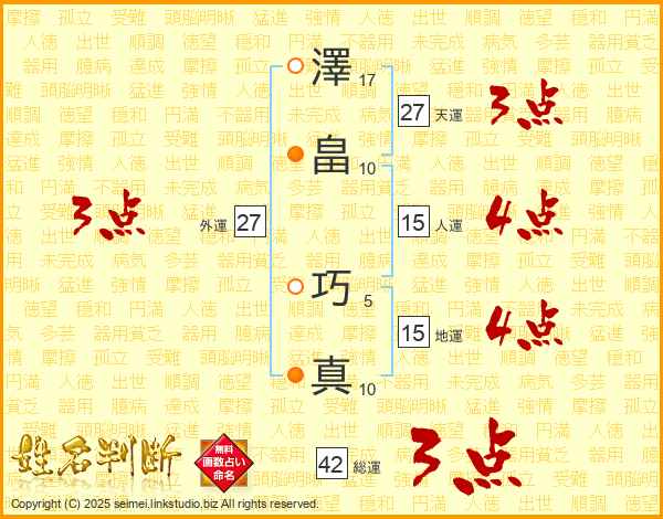 澤(17画)畠(10画) 巧(5画)真(10画)