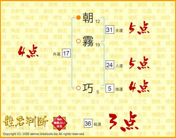 朝霧巧さんの天運は31画の5点!