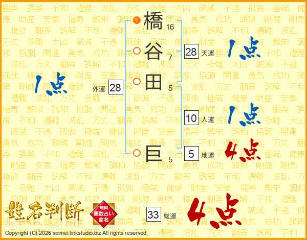 橋谷田巨さんの総運は33画の4点!