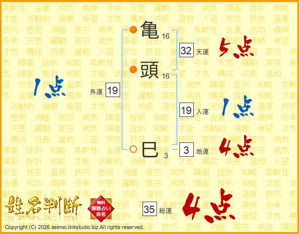 画数の奇数(○陽)と偶数(●陰)の配列で吉凶を占います。どちらかにかたよる名前は大凶名で避ける必要があります。画数の奇数偶数。