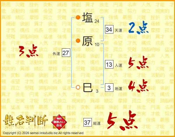 塩原巳さんの総運は37画の5点!