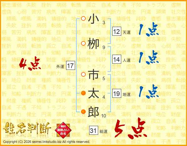小(3画)栁(9画) 市(5画)太(4画)郎(10画)