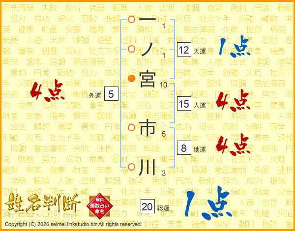 一(1画)ノ(1画)宮(10画) 市(5画)川(3画)