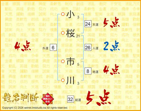 生活面を象徴する運勢です。外部から受ける影響力を表し、結婚運、家庭運や職場、環境への順応性を表します。総運から人運を引いた画数。姓や名が1文字の場合を除く。