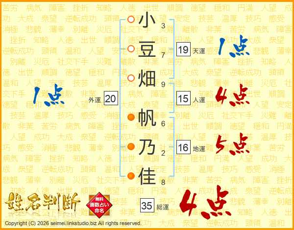 小豆畑帆乃佳さんの総運は35画の4点!