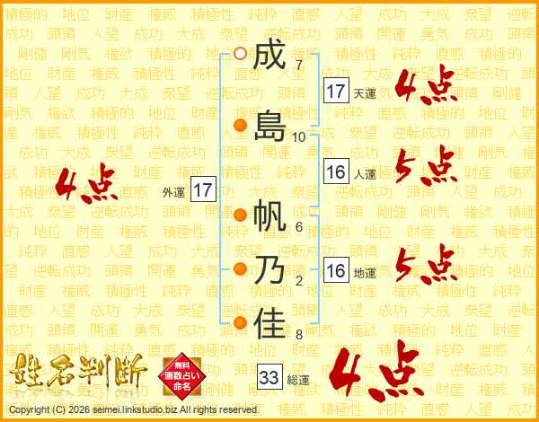 成(7画)島(10画) 帆(6画)乃(2画)佳(8画)