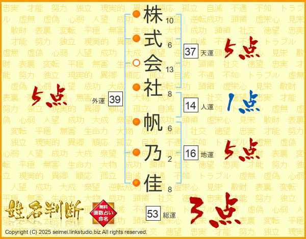 株式会社帆乃佳さんの外運は39画の5点!