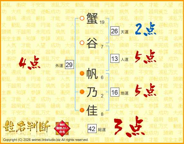 蟹谷帆乃佳さんの天運は26画の2点!