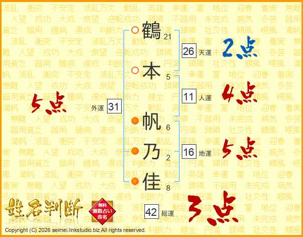 鶴(21画)本(5画) 帆(6画)乃(2画)佳(8画)