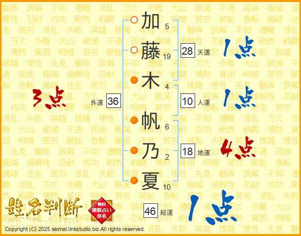 加(5画)藤(19画)木(4画) 帆(6画)乃(2画)夏(10画)