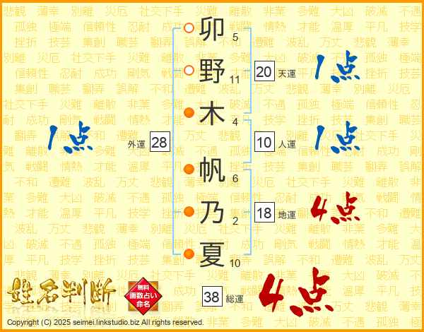 卯(5画)野(11画)木(4画) 帆(6画)乃(2画)夏(10画)