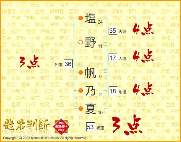 塩(24画)野(11画) 帆(6画)乃(2画)夏(10画)