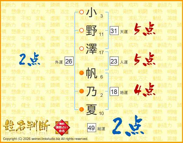 小(3画)野(11画)澤(17画) 帆(6画)乃(2画)夏(10画)