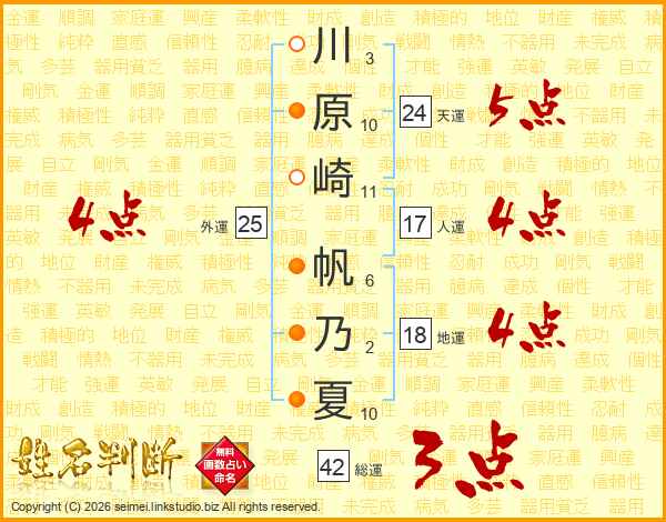 川(3画)原(10画)崎(11画) 帆(6画)乃(2画)夏(10画)
