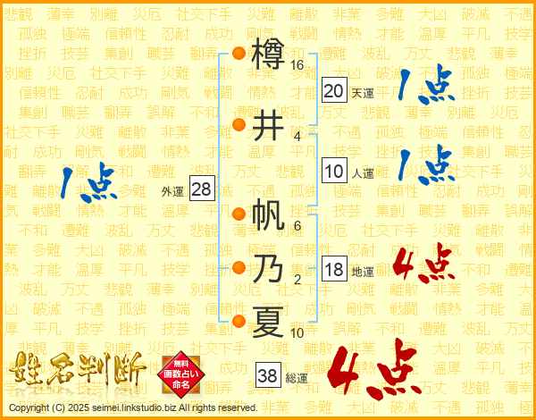 樽(16画)井(4画) 帆(6画)乃(2画)夏(10画)