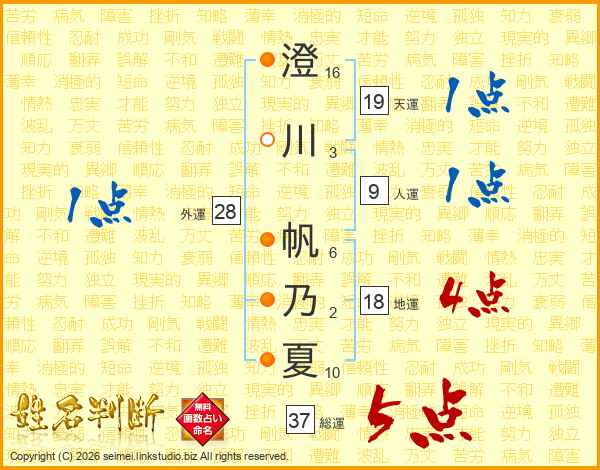 澄(16画)川(3画) 帆(6画)乃(2画)夏(10画)