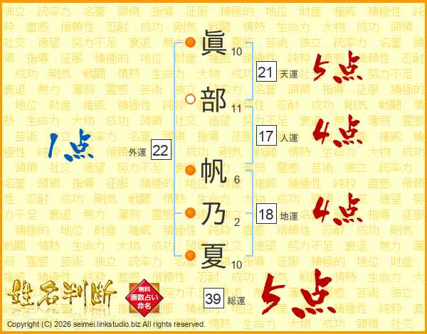 眞部帆乃夏さんの総運は39画の5点!
