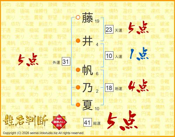 藤(19画)井(4画) 帆(6画)乃(2画)夏(10画)