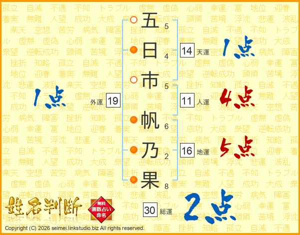 画数の奇数(○陽)と偶数(●陰)の配列で吉凶を占います。どちらかにかたよる名前は大凶名で避ける必要があります。画数の奇数偶数。