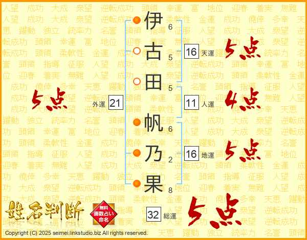 伊(6画)古(5画)田(5画) 帆(6画)乃(2画)果(8画)