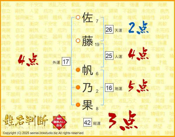 佐(7画)藤(19画) 帆(6画)乃(2画)果(8画)