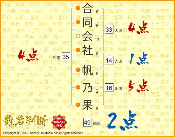 合(6画)同(6画)会(13画)社(8画) 帆(6画)乃(2画)果(8画)