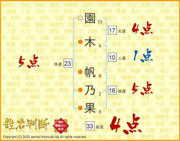 園(13画)木(4画) 帆(6画)乃(2画)果(8画)