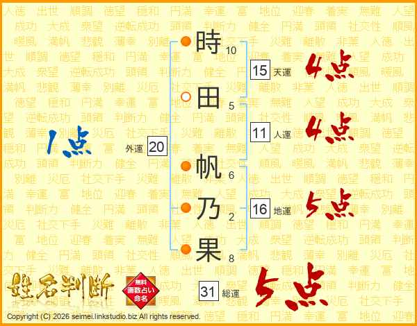 時(10画)田(5画) 帆(6画)乃(2画)果(8画)
