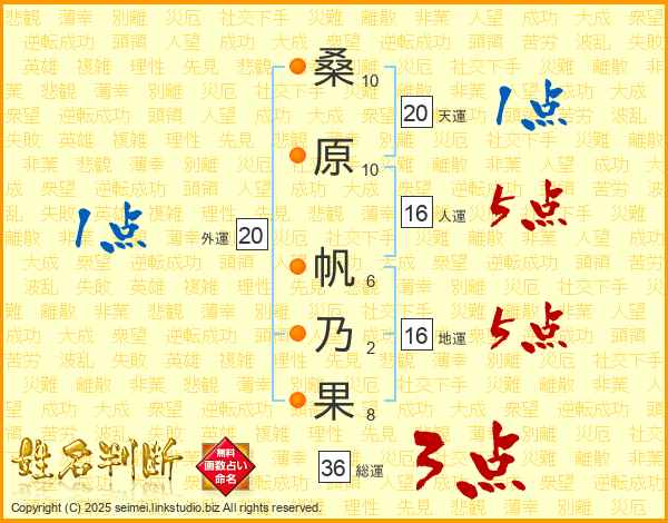 桑(10画)原(10画) 帆(6画)乃(2画)果(8画)