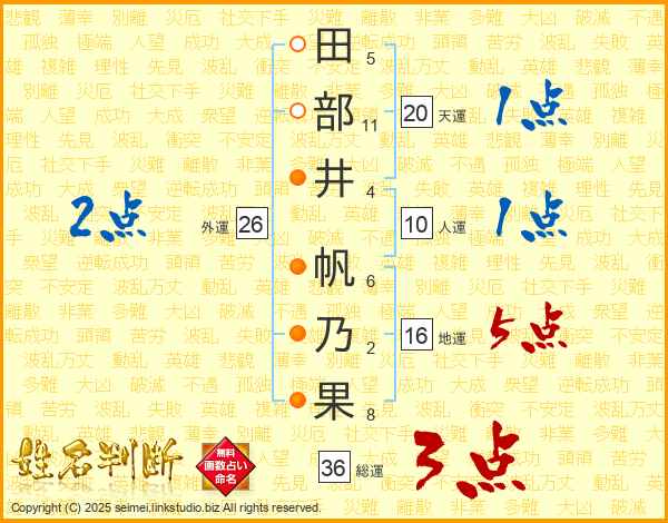 田(5画)部(11画)井(4画) 帆(6画)乃(2画)果(8画)