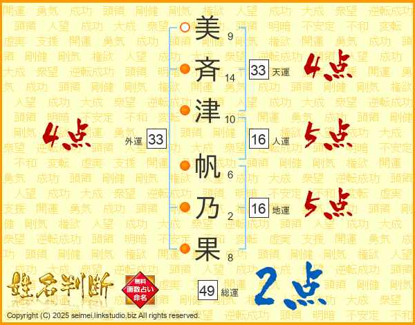 美(9画)斉(14画)津(10画) 帆(6画)乃(2画)果(8画)