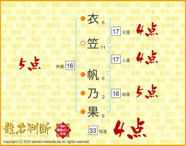 生活面を象徴する運勢です。外部から受ける影響力を表し、結婚運、家庭運や職場、環境への順応性を表します。総運から人運を引いた画数。姓や名が1文字の場合を除く。