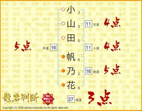 小(3画)山(3画)田(5画) 帆(6画)乃(2画)花(8画)