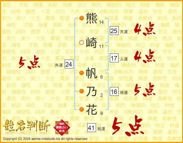 熊(14画)崎(11画) 帆(6画)乃(2画)花(8画)