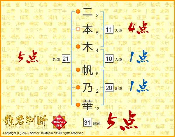 二(2画)本(5画)木(4画) 帆(6画)乃(2画)華(12画)