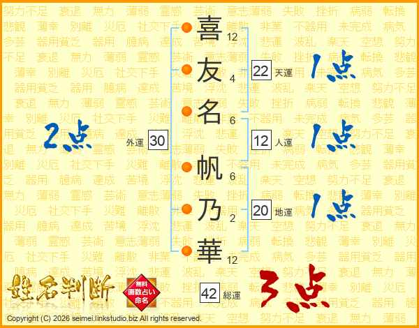 喜(12画)友(4画)名(6画) 帆(6画)乃(2画)華(12画)