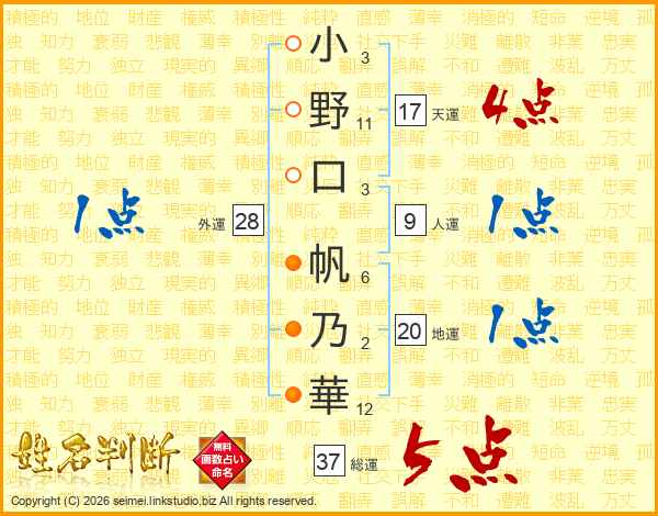 小(3画)野(11画)口(3画) 帆(6画)乃(2画)華(12画)