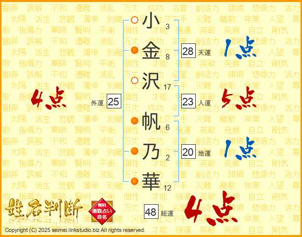 小(3画)金(8画)沢(17画) 帆(6画)乃(2画)華(12画)