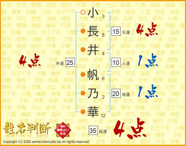小(3画)長(8画)井(4画) 帆(6画)乃(2画)華(12画)