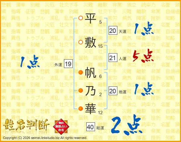平(5画)敷(15画) 帆(6画)乃(2画)華(12画)