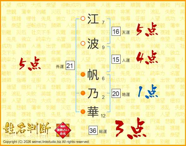 江(7画)波(9画) 帆(6画)乃(2画)華(12画)
