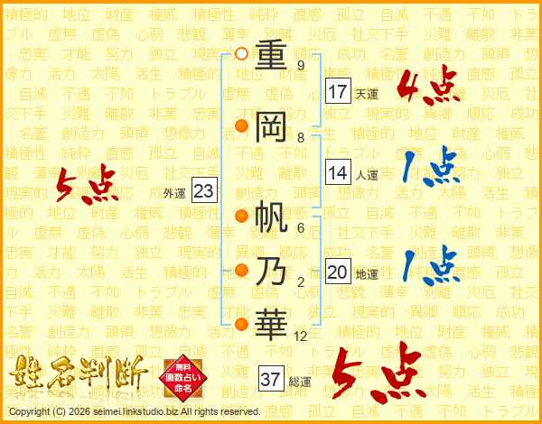 重岡帆乃華さんの総運は37画の5点!