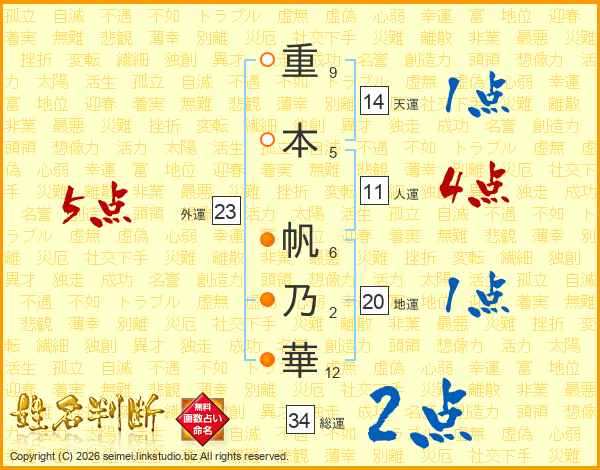 重(9画)本(5画) 帆(6画)乃(2画)華(12画)