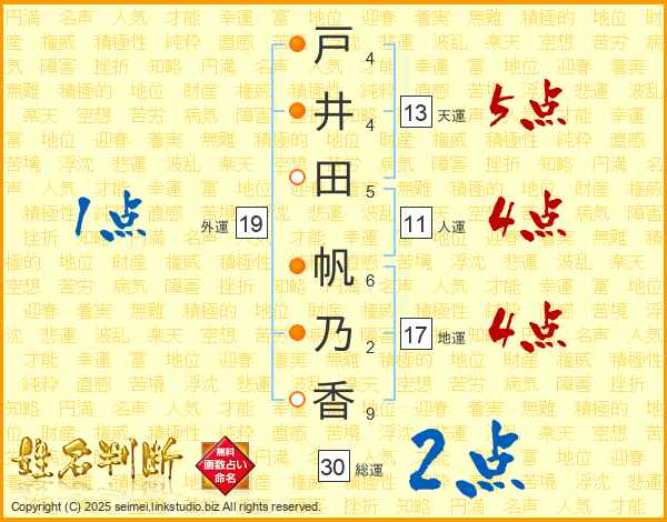 戸(4画)井(4画)田(5画) 帆(6画)乃(2画)香(9画)