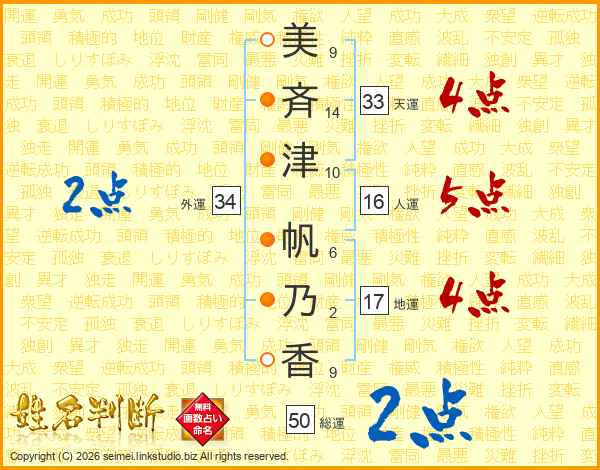 美(9画)斉(14画)津(10画) 帆(6画)乃(2画)香(9画)