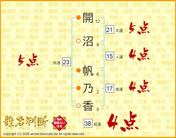 開(12画)沼(9画) 帆(6画)乃(2画)香(9画)