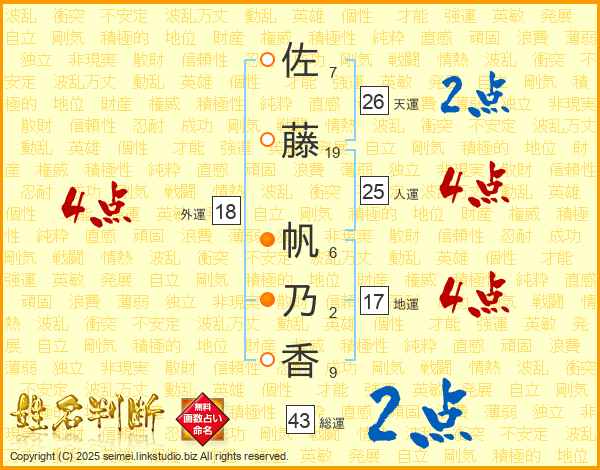 佐(7画)藤(19画)  帆(6画)乃(2画)香(9画)